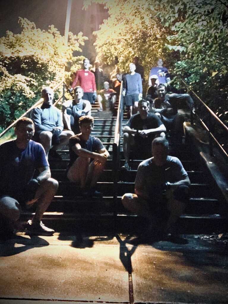 Station to Station: PAX split into groups, then ran through ten stations performing twenty reps of select exercises at each. Exercises included Squats; Merkins; Step-Ups;Carolina Dry Docks; Lunge Steps; Derkins; Bonnie Blairs; Merkins; Squat Jumps;Burpees (only 10). PAX returned to field and performed more Airmen to pick up the six.