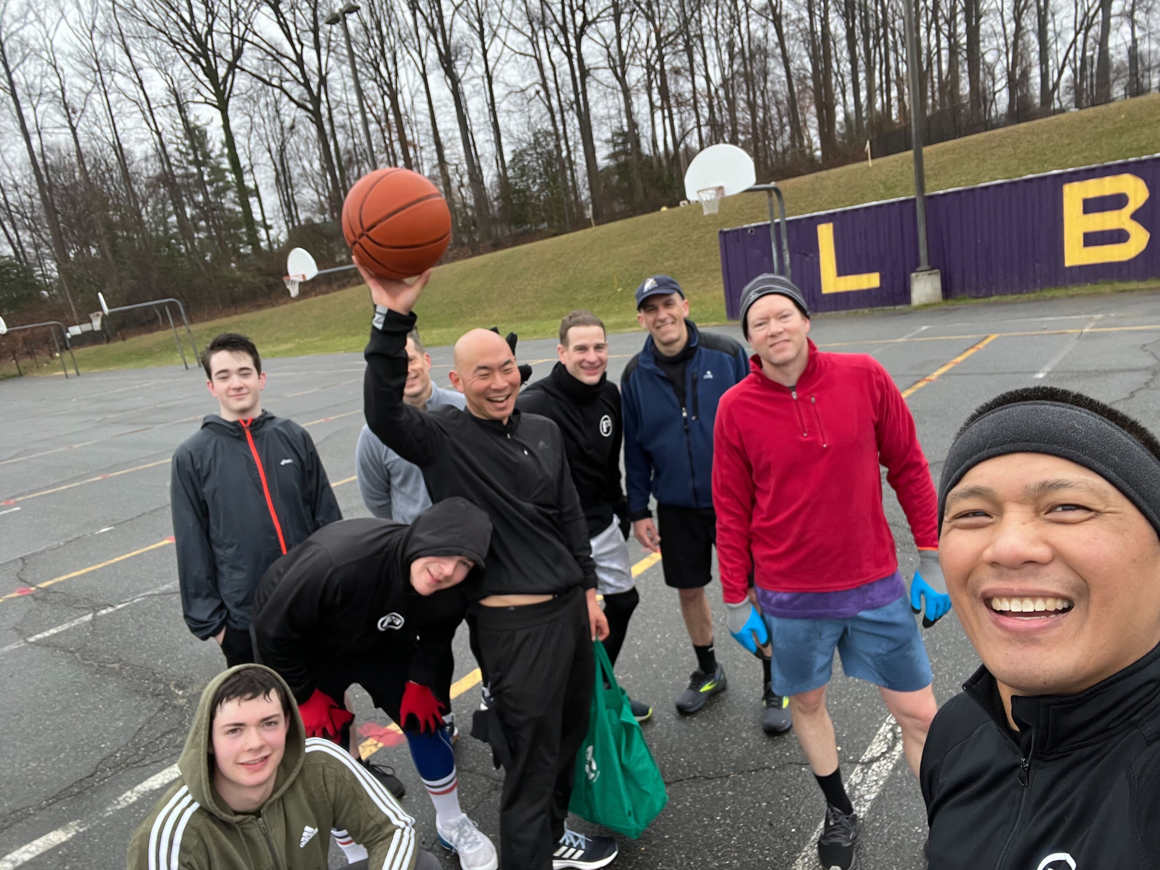Several stretches then fellowship jog around LBSS. 1st in back courtyard for more stretching then air squats and derkins. Then back to fellowship jog to front of school for high knee step ups and more air squats. Then fellowship jog back to stadium steps.