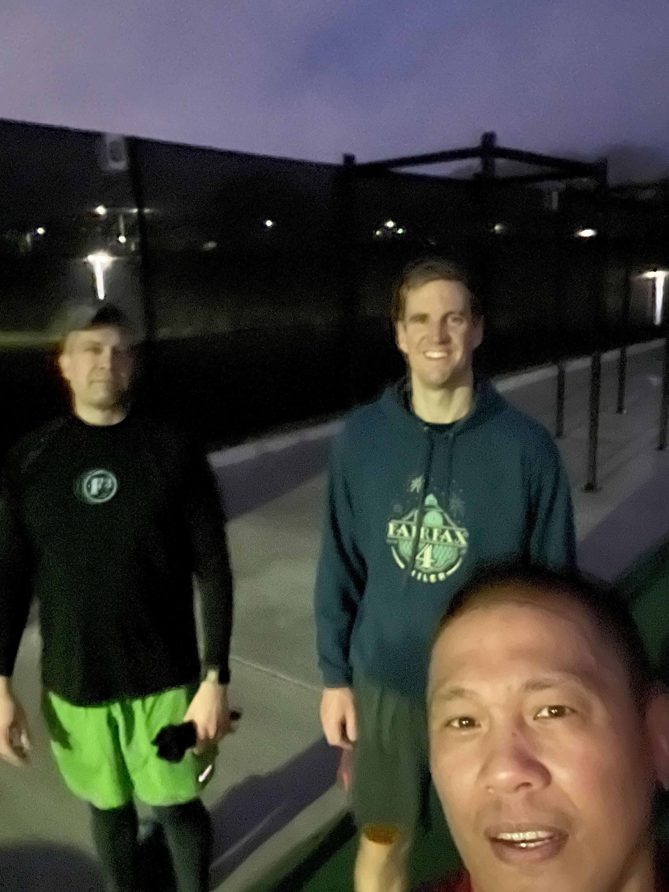 Lots of warm up exercises and stretching. Followed up by shuttle run on Pickle Ball courts.