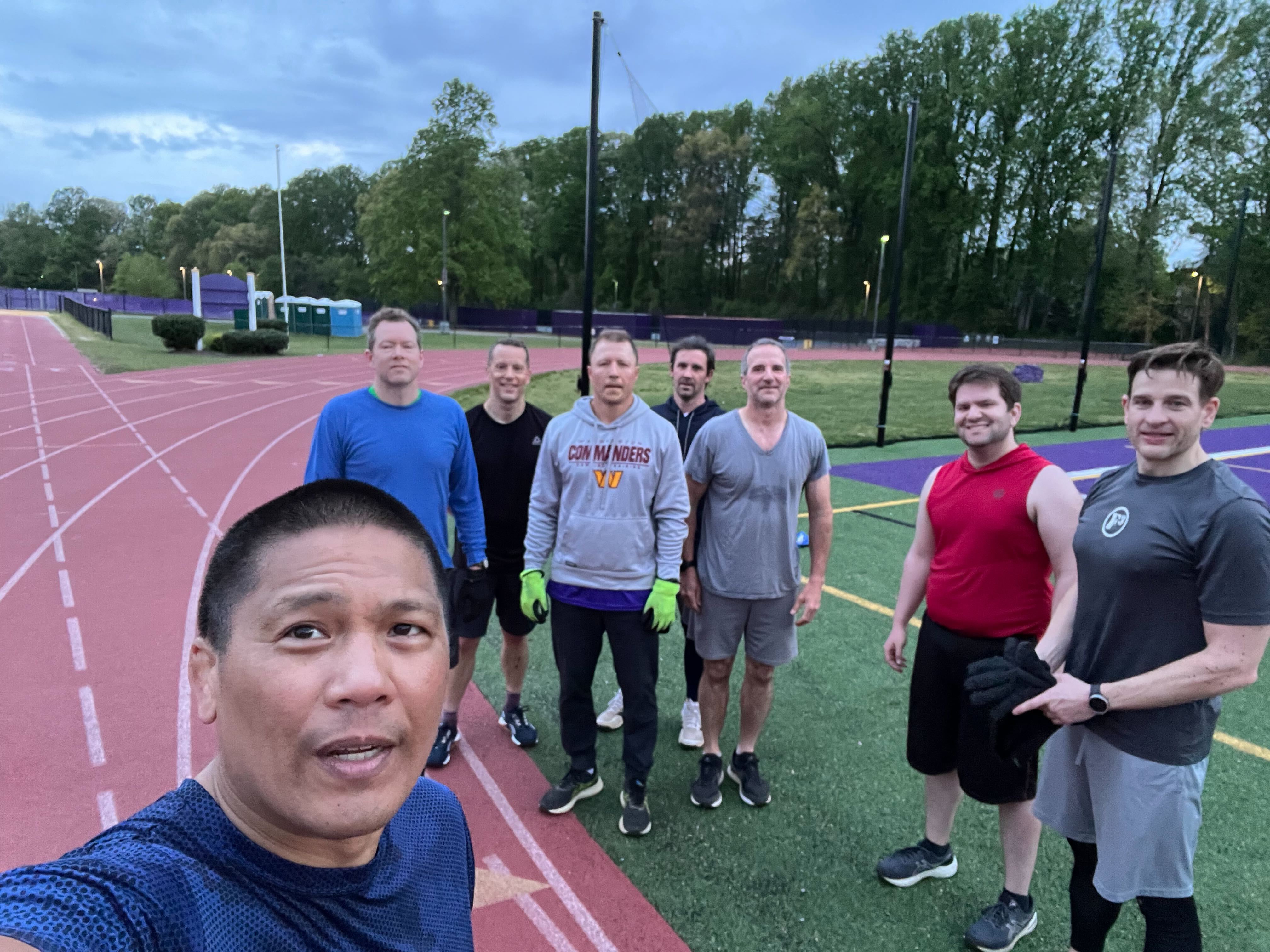 Fellowship laps to warm up legs and body. Then transitioned to low lunge walk, to butt kickers, to high knees. Then stopping to continue to stretch out. Followed by another fellowship lap.