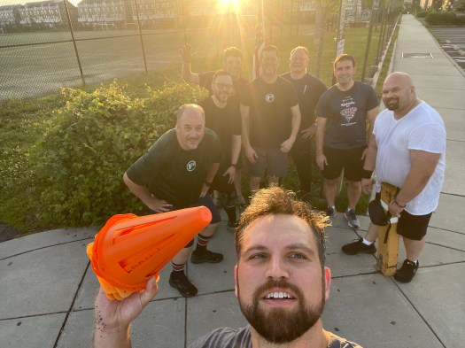 ◦ Overhead, triceps stretches. Do one arm, count to 40 around circle. Switch side and repeat ◦ Mosey around the triangle (warm up jog)