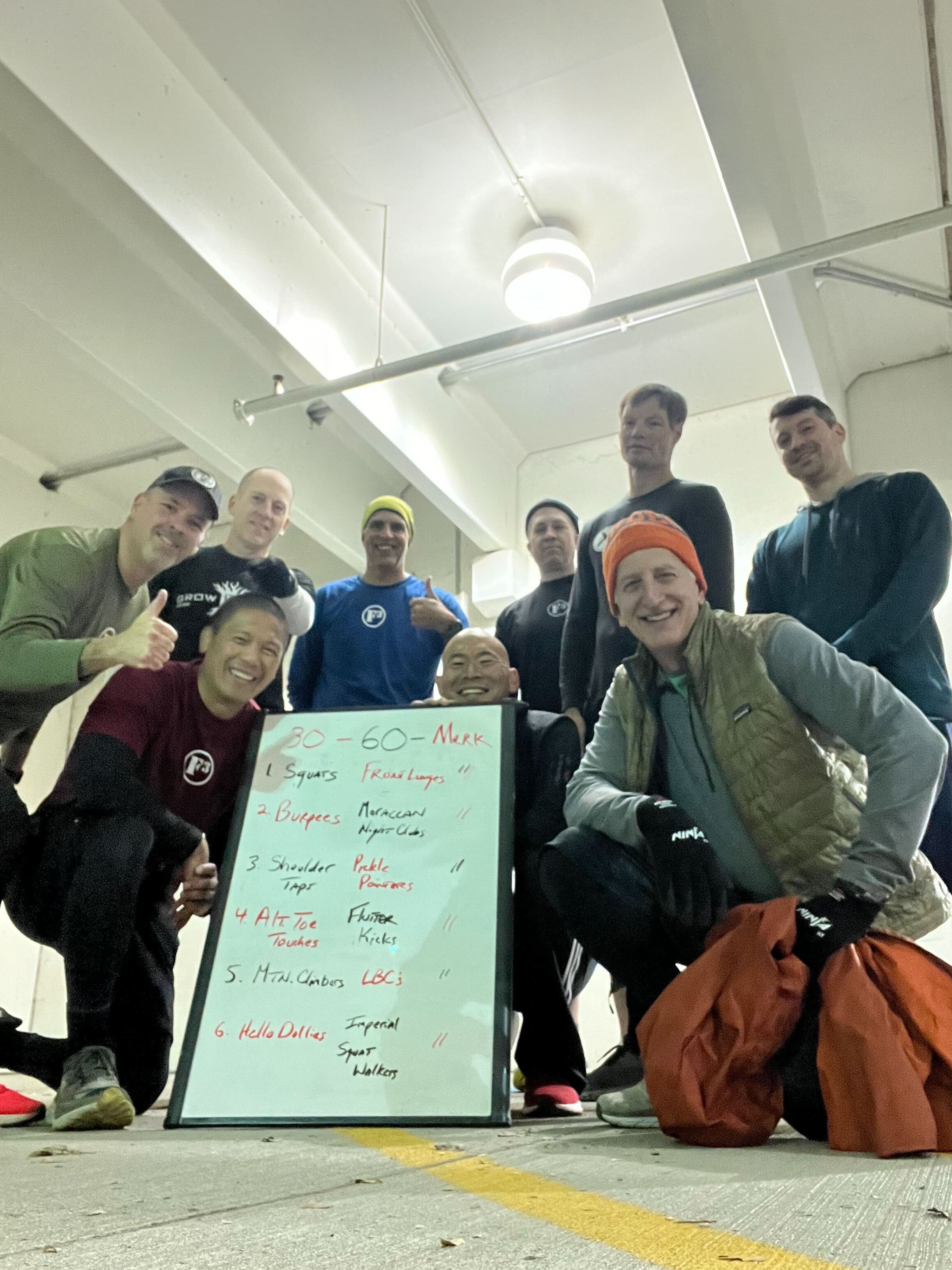 2. Burpees-30sec/ Moroccan Night Clubs-60sec/ Merkins-45sec. 3. Shoulder Taps-30sec/ Pickle Pointers-60sec/ Merkins-45sec 4. Alt. Toe Touches-30sec/ Flutter Kicks-60sec/ Merkins-45sec 5. Mountain Climbers-30sec/ LBCs-60sec/ Merkins-45sec
