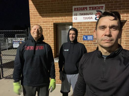 Hand release merkins, squats, rows, thrusters performed 10 of each at the 10 yard line, 20 at the 20 etc down the length of the field.