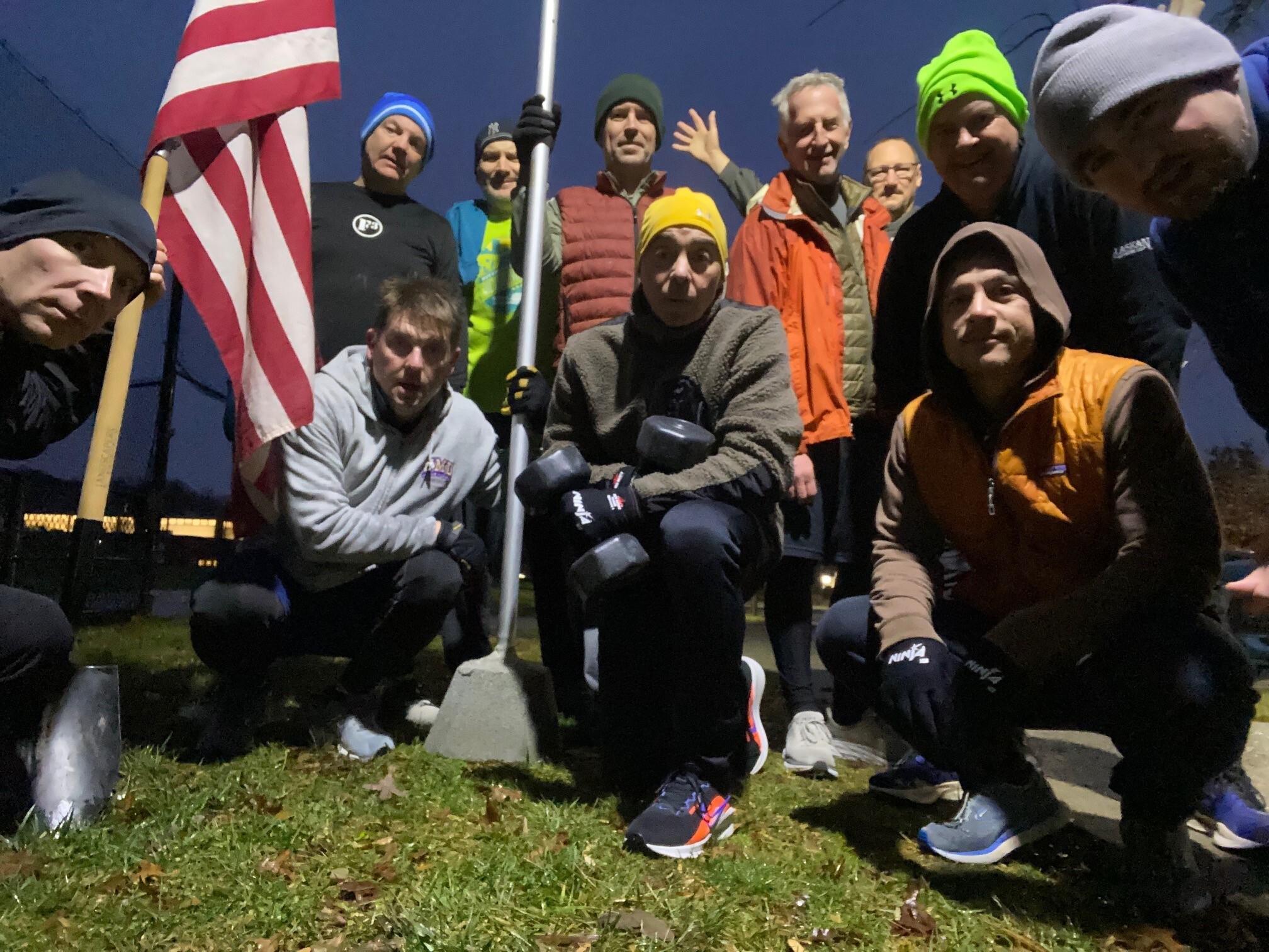 PAX lined up in pairs on the 50-yard line. Each team took turns carrying the Festivus pole to the goal line while the other team member did a high knee, jubilant skip alongside of him. Switching positions at the goal line. The remaining PAX performed a number of exercises while waiting their turns: Mountain Climbers, Star Jumps, LBC’s, Heisman Shuffle, Bonnie Blair’s