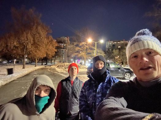 Ran to nearby stairwell to beat the cold.