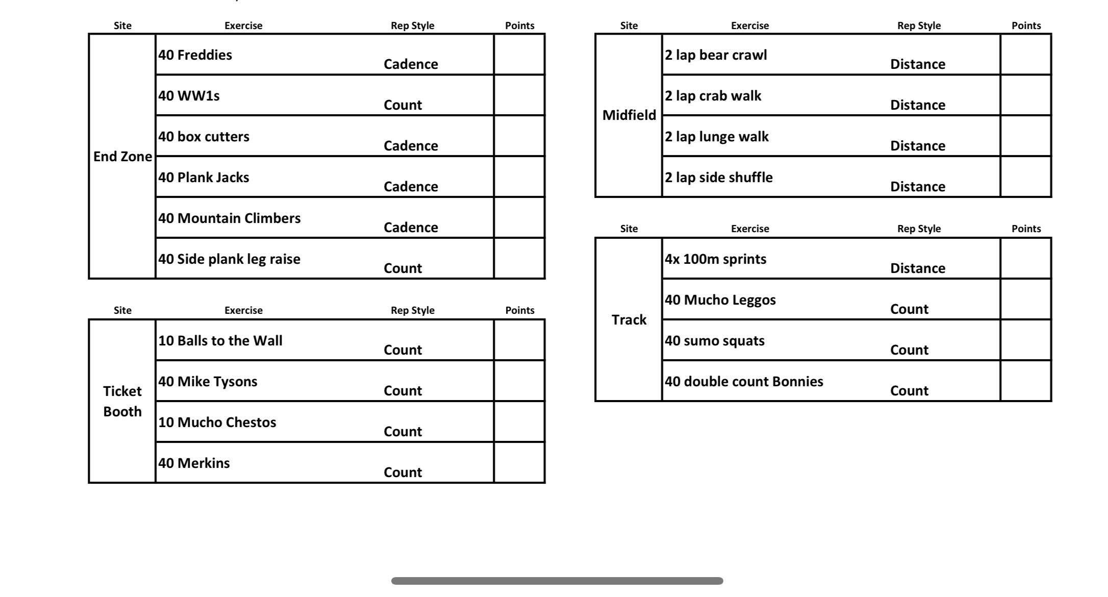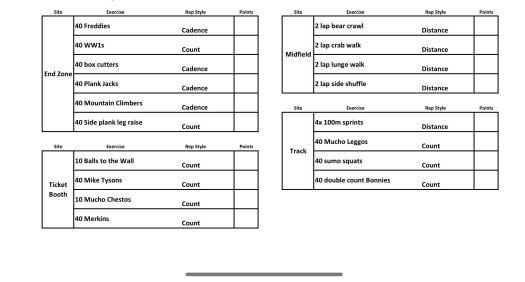 THE THANG: After breaking up into 5 teams, we did exercises at 4 stations. MARY: in the end zone!