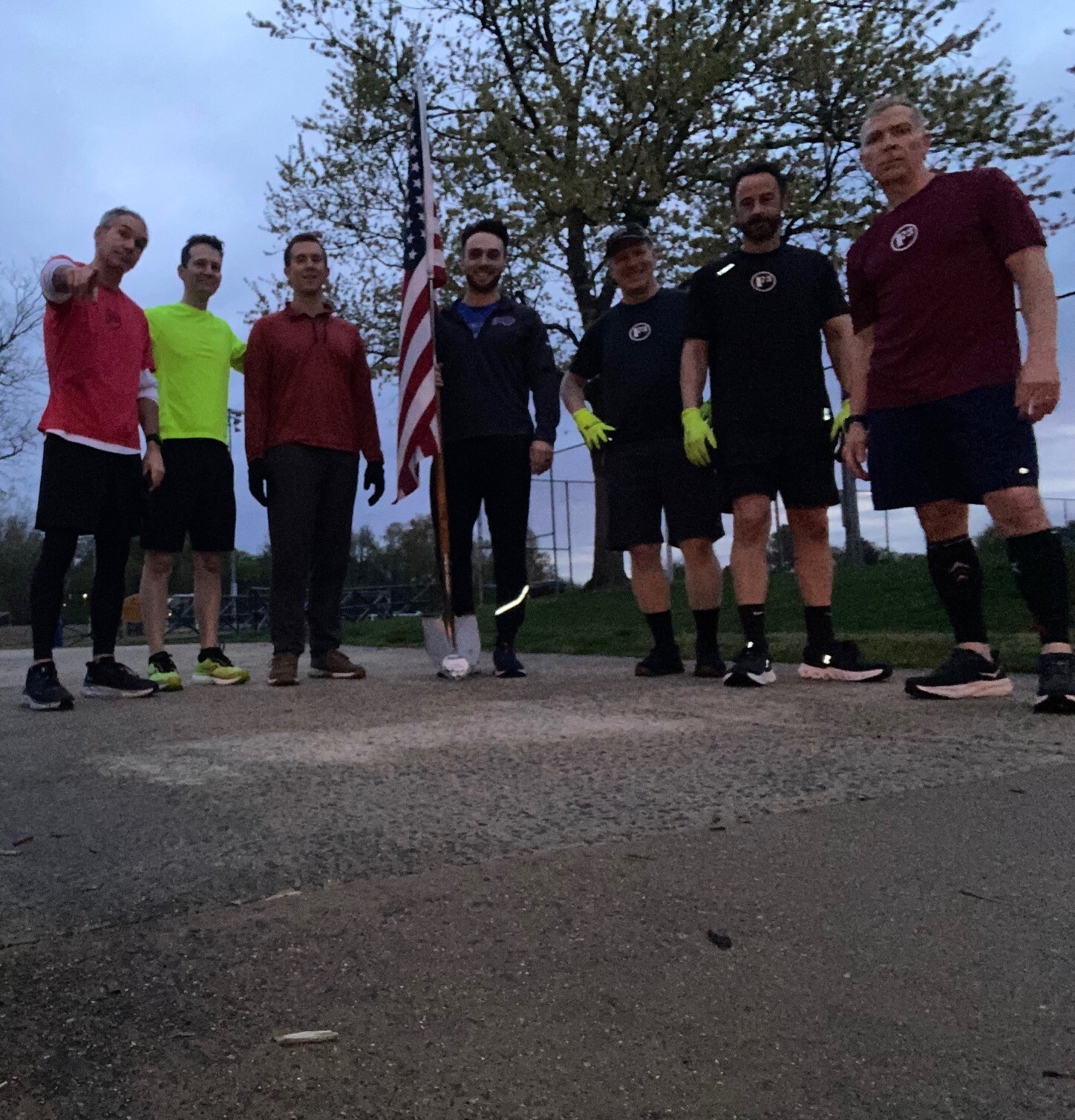 Mosey’d around the perimeter stopping for Bird Dog Merkins – 10, Alternating Shoulder Taps – 20 , Calf Raises – 20