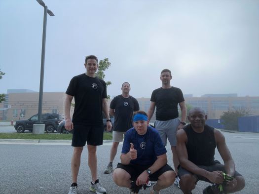 THE THANG: We had 4 rounds running around the track and into the parking lot. At 4 places in the parking lot we did 10 burpees, at the other end of the circuit were rings (toes to the sky), pull up, and chin-up bars. Each round we did one rep and added one. MARY: Big boi, flutter kicks, LBC
