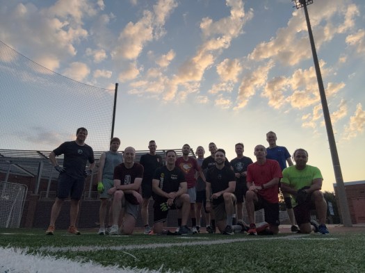 Split into teams of 3. With two cones at opposite corner flags on the soccer field, one teammate is at each cone doing an exercise and one teammate is running between the cones as the timer. When the timer gets to a cone, he starts doing the exercise and the other becomes the timer. Each corner had a list of exercises to perform, and the objective was to maintain a constant pace during the ~90 seconds until you become the timer: