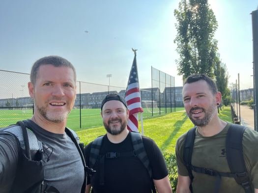 After a short warm-up, we rocked a little over 4 miles, stopping wants to do some Bulgarian split squats, shoulder press, flutter kicks, and chest press with our rucks.