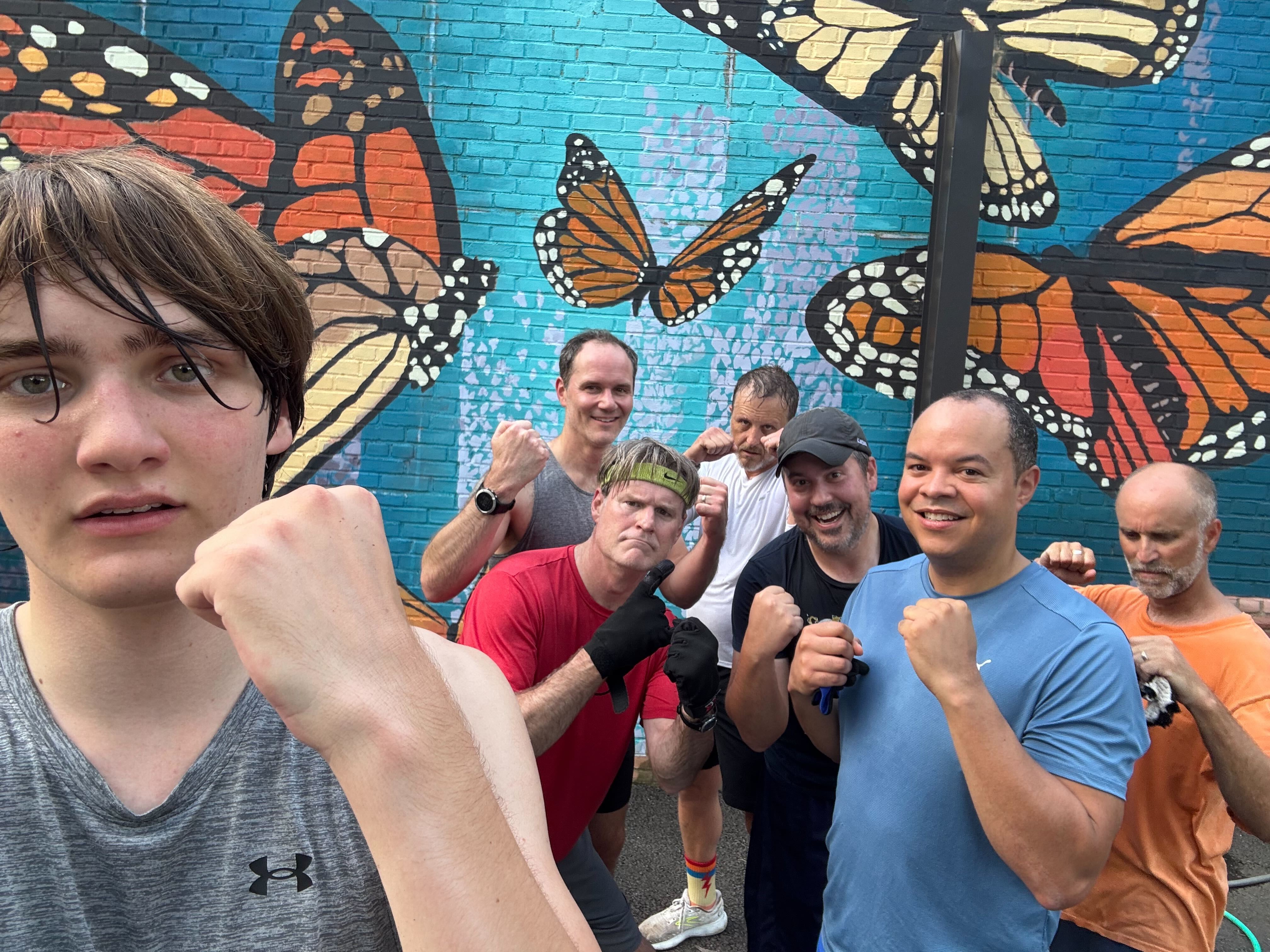 THE THANG: partner up. Boxing w gloves & mitts. Othe pax run to front for shoulder taps and partner hand tap merkins. 2x. Coupons. OH press. Curls. BO rows. Squats. Chest press.