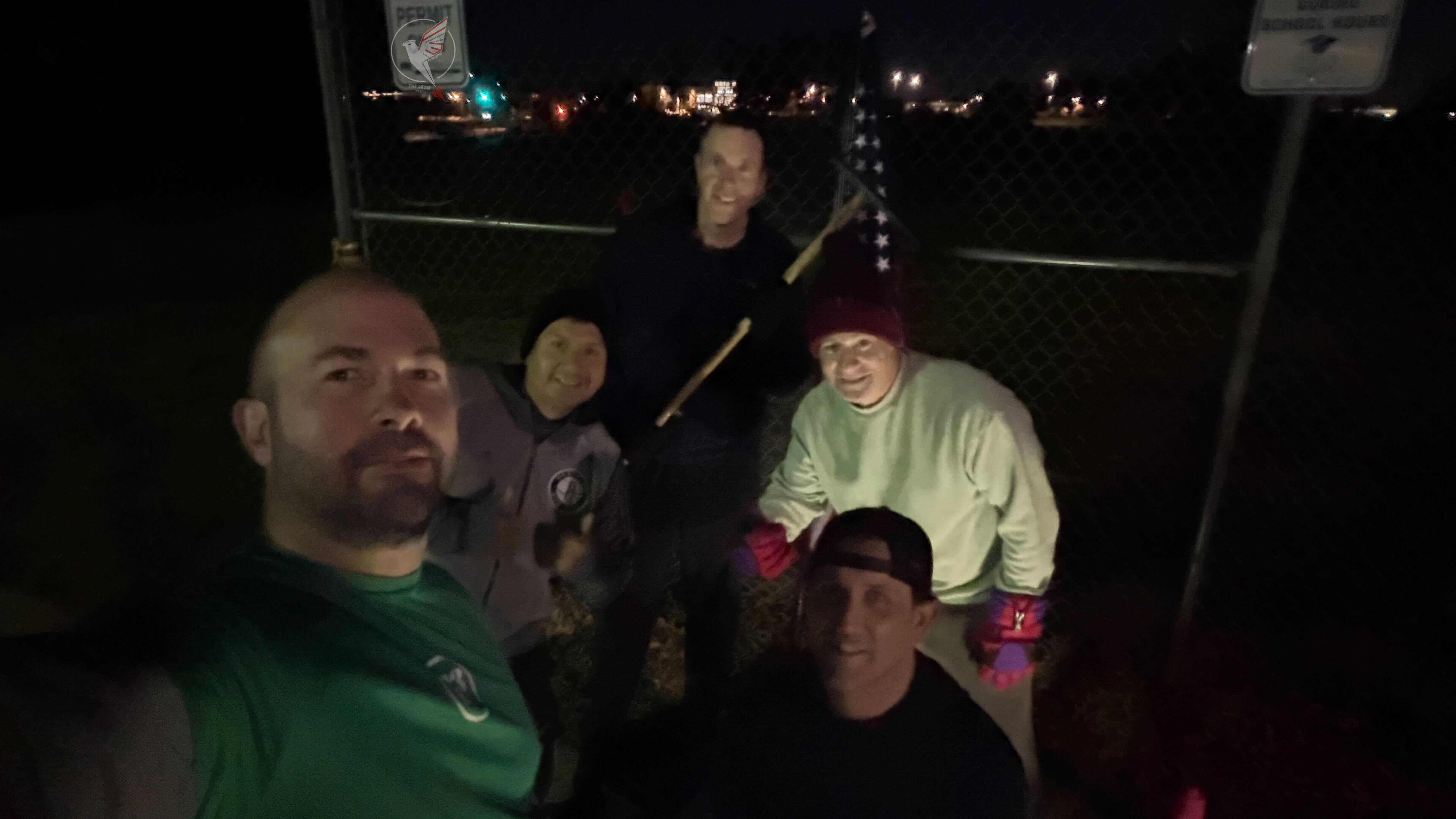 YHC set up a broom pole with folded pieces of paper taped all along and around the shaft. Each piece of paper has an exercise and reps written on it. The result is something that kind of resembles a pathetic looking xmas decoration worthy of Charlie Brown. This was set up on the far sideline.