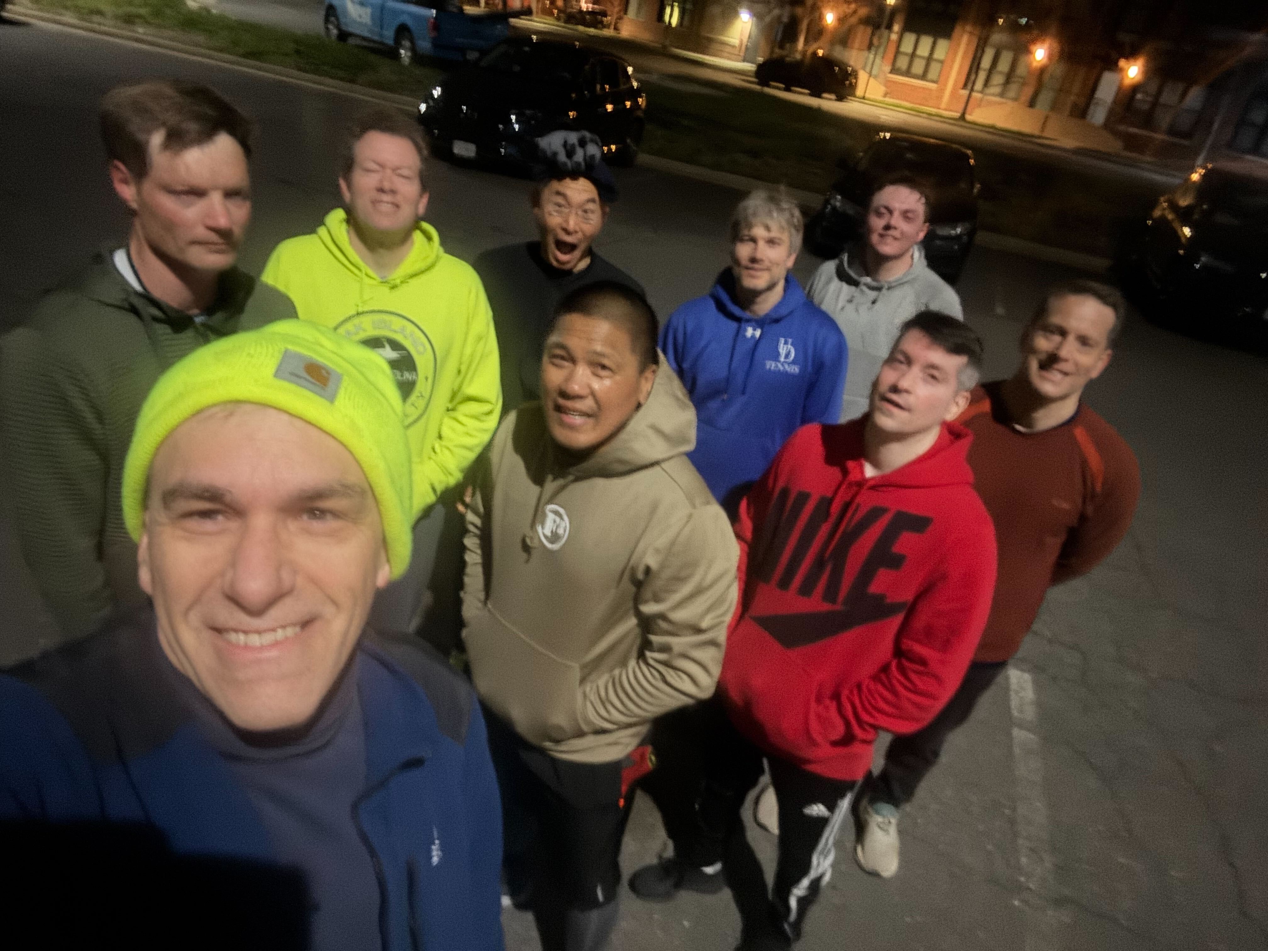 WARMUP: cherry twists, imperial walkers, hillbillies, side, straddle, hop, town, dog, world’s greatest stretch, cobra Kai, mosey to third floor of parking garage THE THANG: