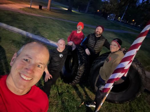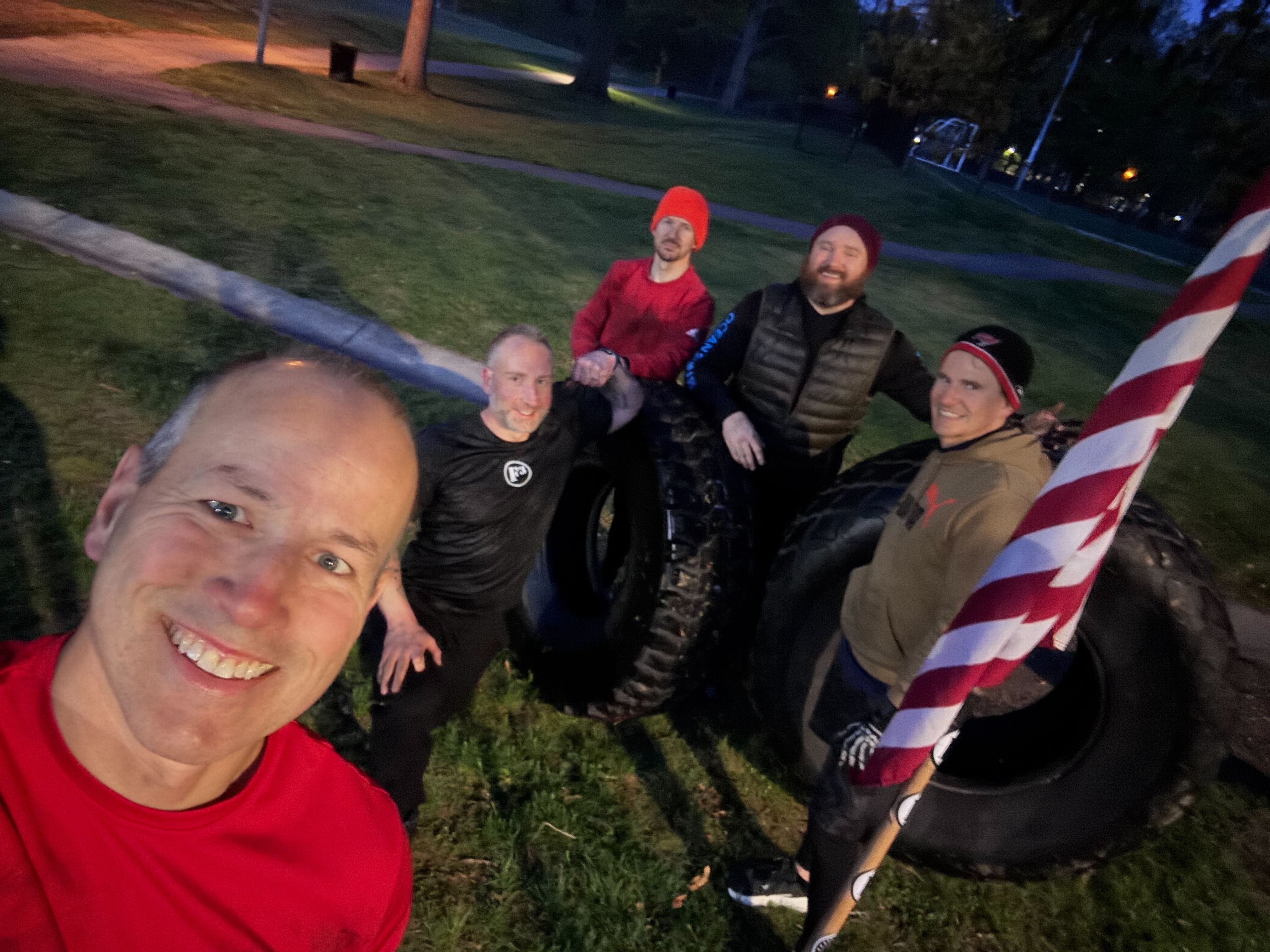 Roll the tires to the playground. Two sets of pull-ups. Then one team does up and over on the playground with a tire while the other team does a picnic table carry. Final station was up and over’s with the tires on the fence line. MARY: staying with the tire theme, of course we did bicycle crunch! ANNOUNCEMENTS: DC area convergence is coming up