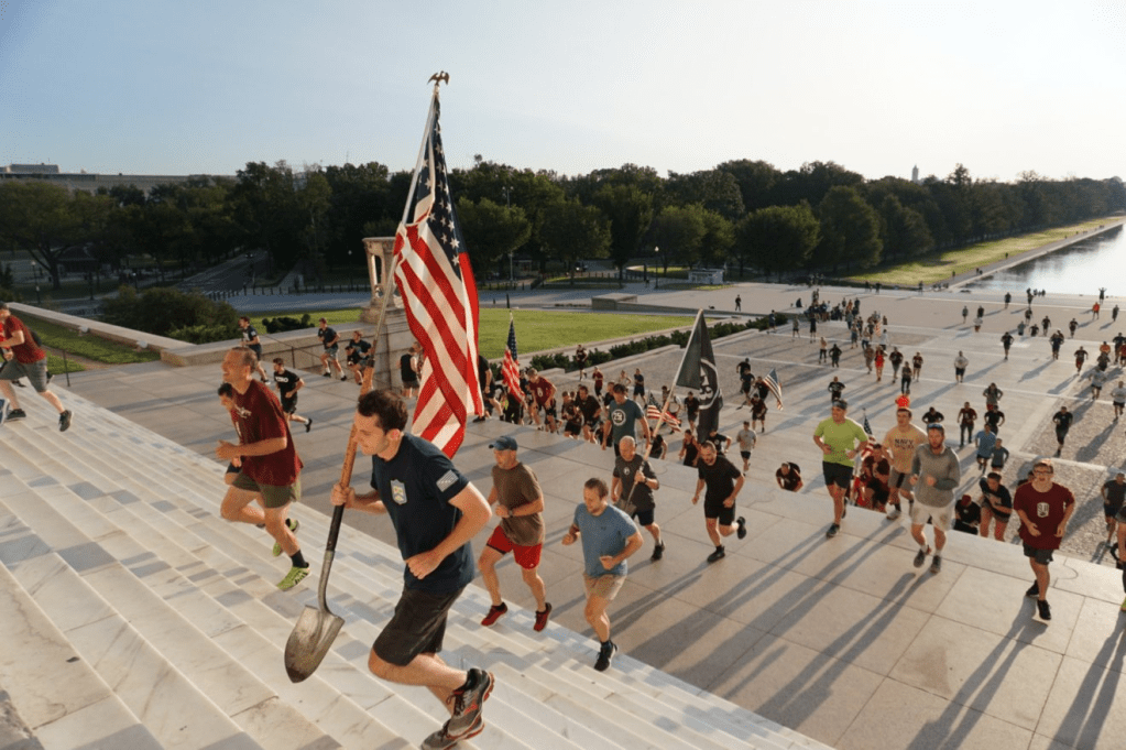 PAX honor the fallen in several ways, choosing to climb, run, or ruck the stairs. Some carry flags, others memorials to honor individual.