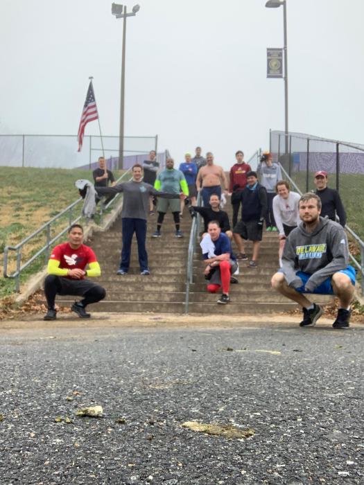 The PAX found some toys on the field, including the usual cement blocks, a jumping box (12, 20, and 30-inch options), 50-lb slam ball, 20-lb wall ball, and…Slosh Pipes of varying size/weight. Seeing all these toys, the PAX went at it like kids on Christmas Day, performing the following: