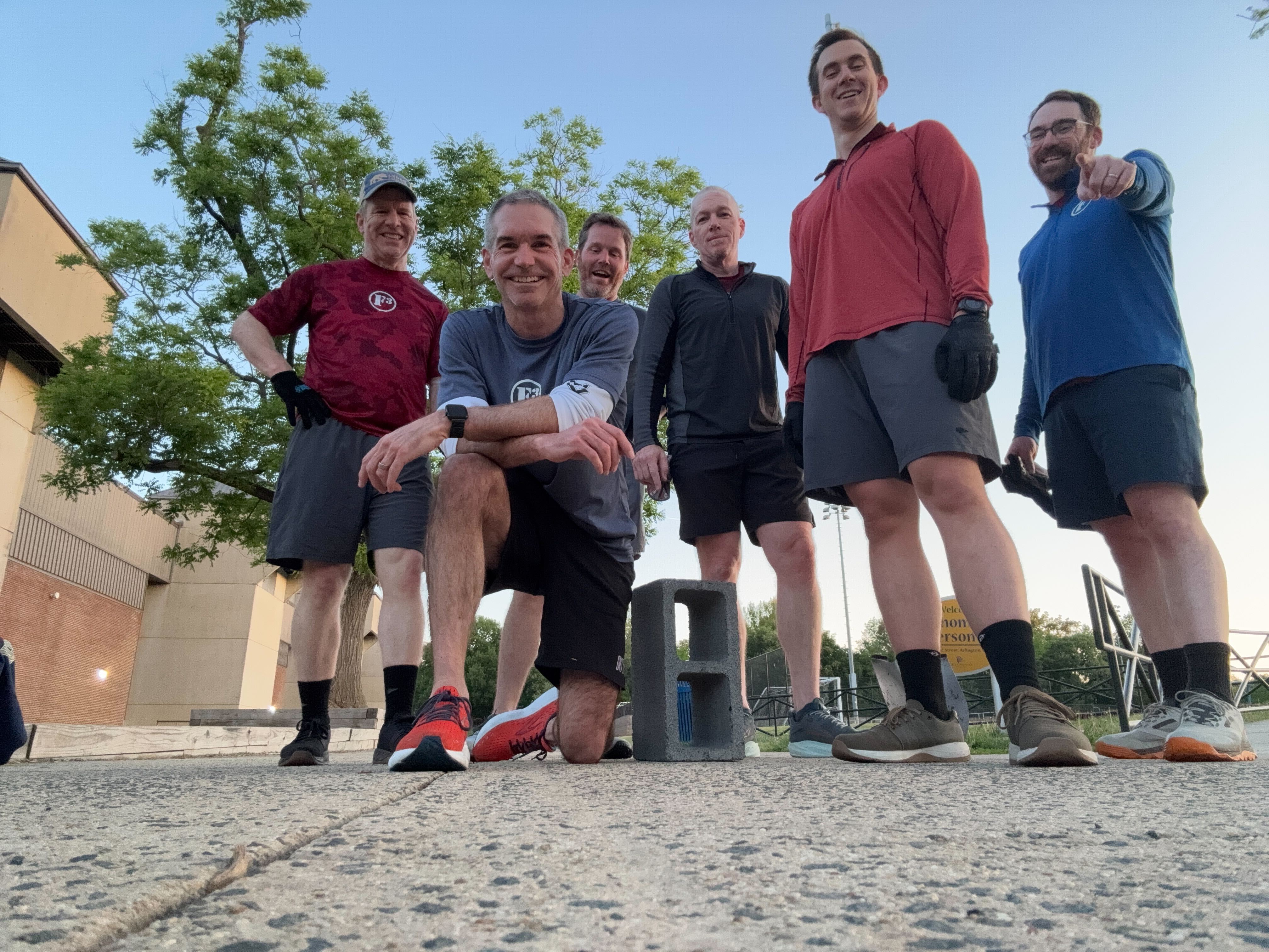 Mosey; Step Ups; Dips; Step Ups; Dips; Step Ups; Mosey; Wall Sit; Bricklayer Merkins; Chicken Peckers; Mosey; Wall Sit; Chicken Peckers; Mosey.
