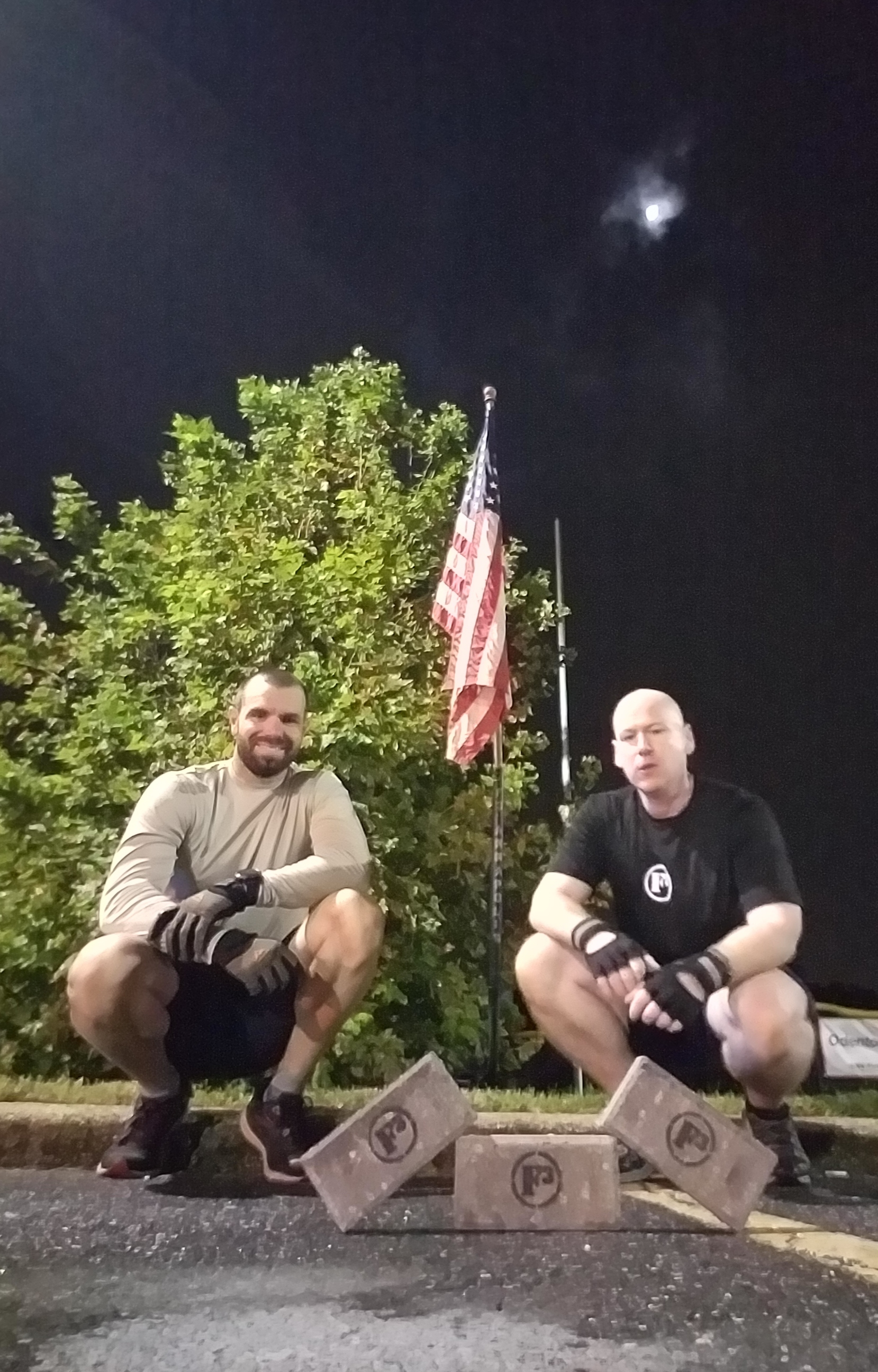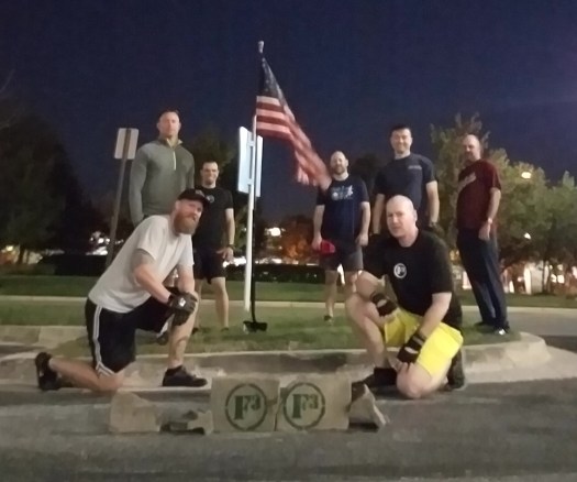 Note: during workout Q lost grip (standing skull crushers), coupon fell and shattered into several pieces. Count-o-rama, name-o-rama, announcements, and shout-out/words of wisdom, prayer.