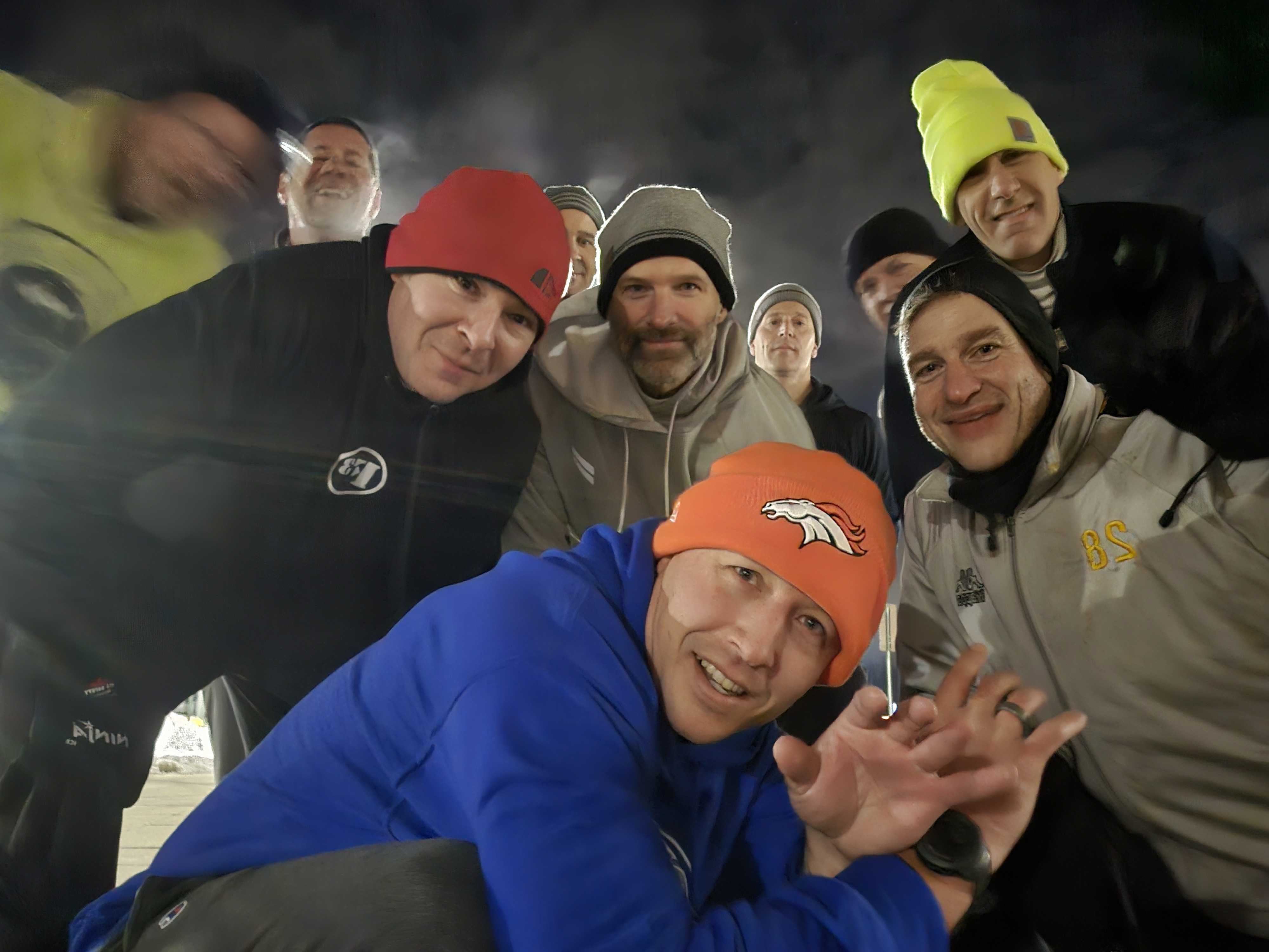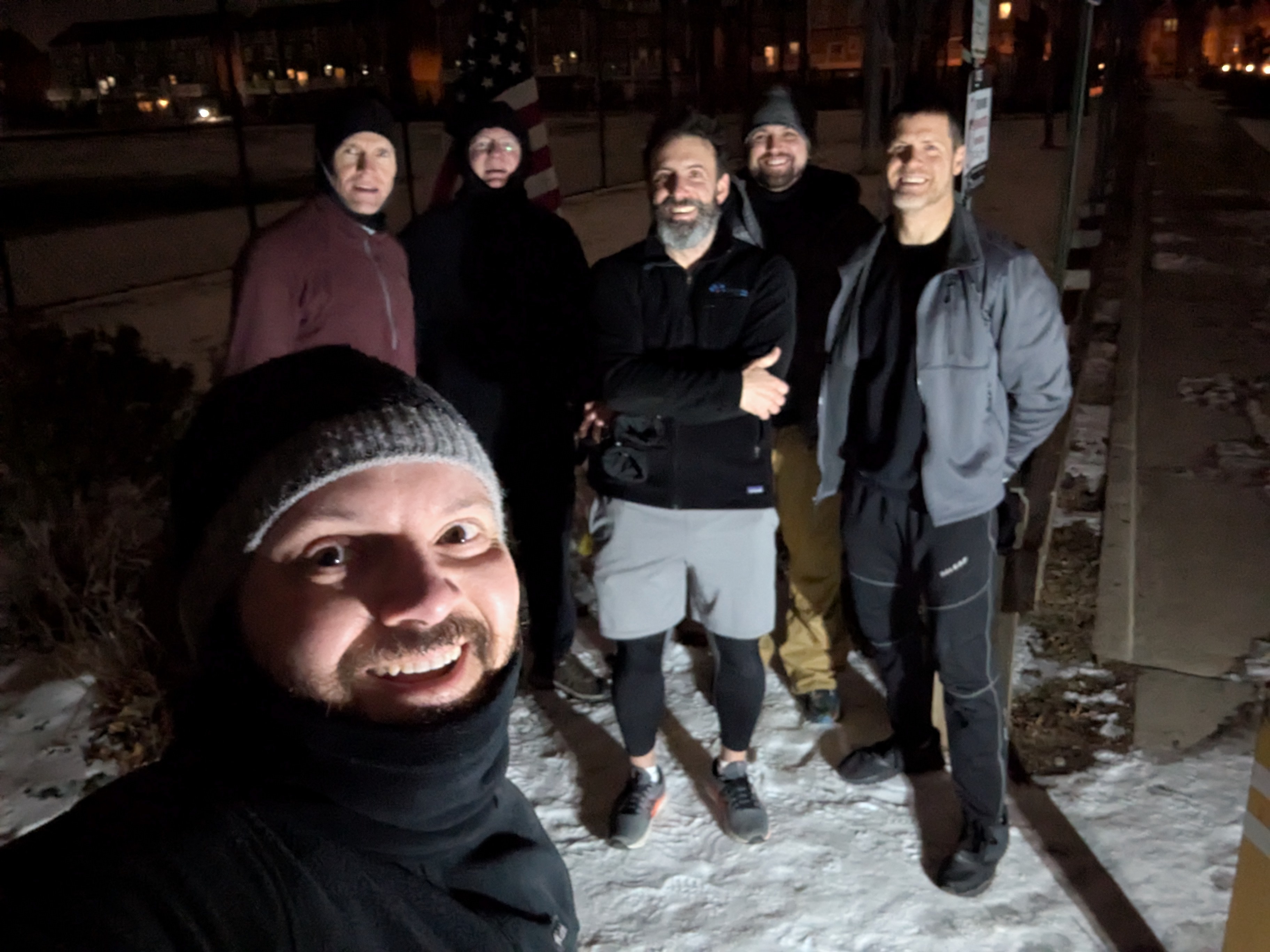 Q led the pas through several neighborhoods stopping for rounds of 5 burpee, 20 jump squats, 20 merkins. At parking lot at Knights of Columbus, cut squares with 10 x merkins, 10 x shoulder taps, 10 x squats, and 10 x LBCs. Concluded with uphill trek, wrong term, and cutting through snow. MARY: None due to time.