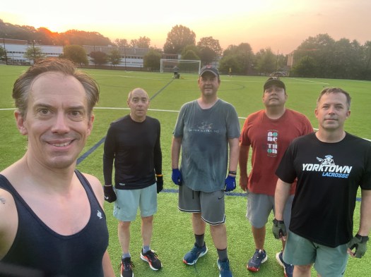 – Final feat of strength was using strap as pully each PAX pair lifted sandbag up fence while others alternated exercises including merkins, wall sits, and more.