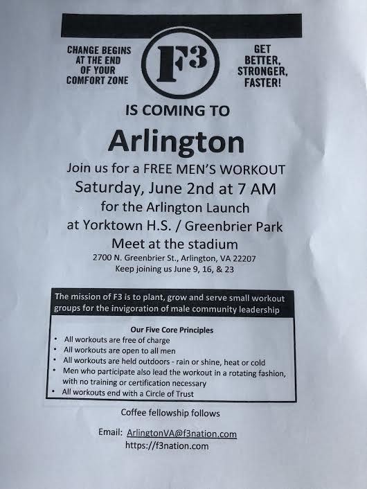 Though at least one resident contacted ARLnow.com to criticize F3’s exclusion of women, Gregory said he hasn’t personally received any criticism for bringing F3 to Arlington. He has about 25 men signed up for the first workout, which is set to take place at 7 a.m. on June 2 at Greenbrier Park, next to Yorktown High School. Photo via Twitter/@F3_Arlington_VA