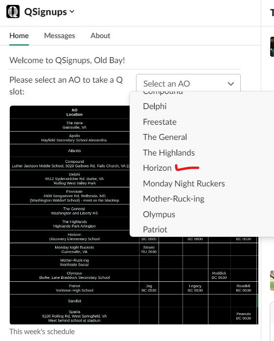 5. Inside the app, you will see the schedule for the next two weeks (which is updated automatically at the top of the hour) and the option to select an AO. To sign up for a Q slot, click Select an AO: