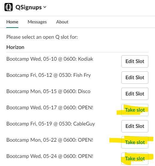 In order to sign up for Q slots, we are now using the QSignups app within Slack. This means you never have to leave the Slack app to sign up for new Q’s, see what Q’s you have coming up, or even see the weekly schedule.